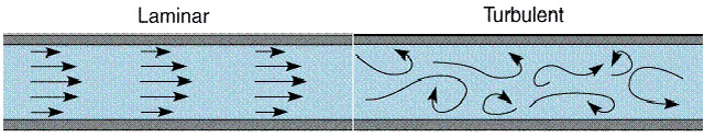 Links in bovenstaande figuur zien we laminaire stroming en rechts zien we turbulente stroming.