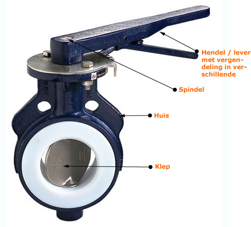 De vlinderklep (butterfly valve) heeft een draaiend klepblad dat bevestigd